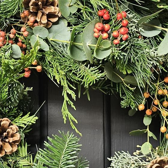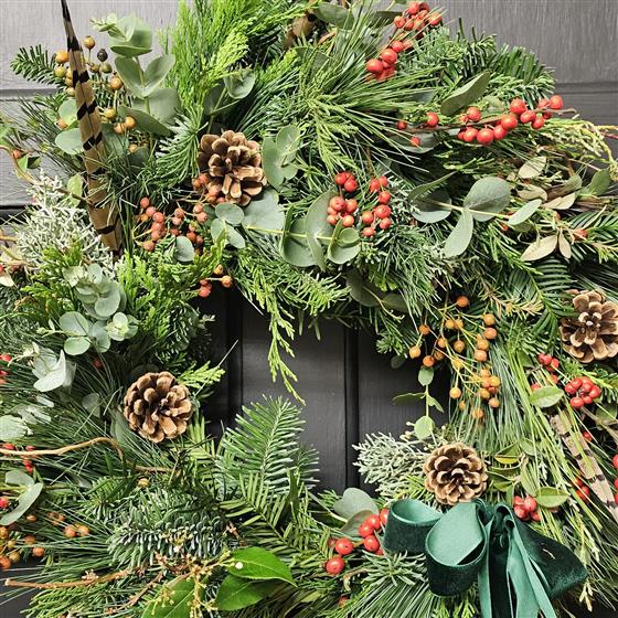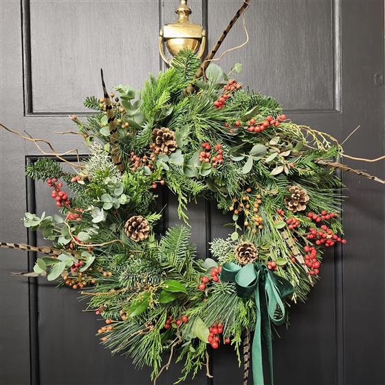 A luxury, bespoke wreath made with a variety of seasonal foliage, pine cones and lush berries. As they are created with a hedgerow feel each wreath will be slightly different! A completely unique wreath for your front door!