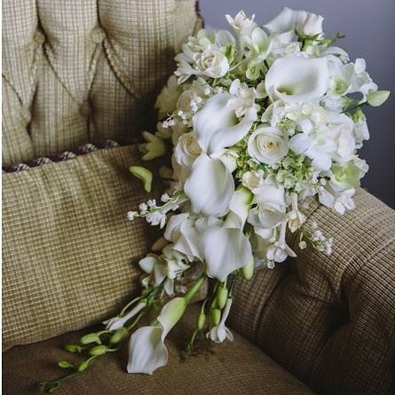 A cascade of delicate fresh flowers that flow like a waterfall from large and dense flowers at the top, tapering towards smaller flowers in a point at the bottom.