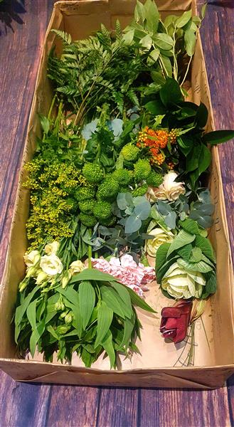Box 1, Red amaryllis, red ilex berries, red roses, feeling green chrysants, greens & gold foliage’s ready to be arranged in the recipients own vase.