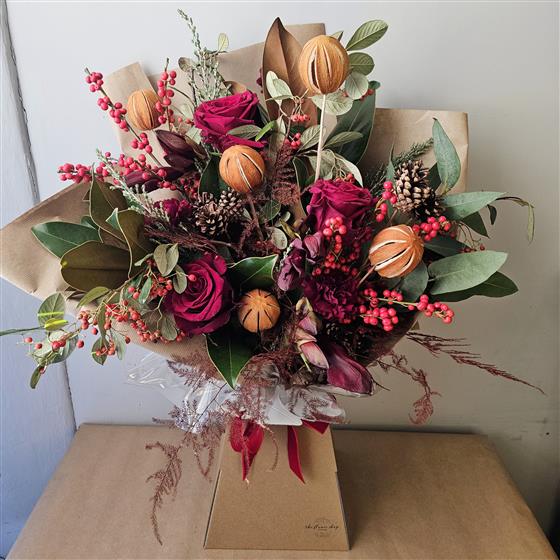 This festive floral bouquet features amaryllis, red roses, ilex berries, carnations, dried oranges, cones & festive foliage.