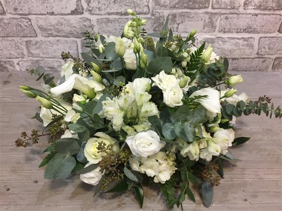 A collection of white and cream flowers with roses, million star and variegated greenery combine to create a simple and beautiful tribute.