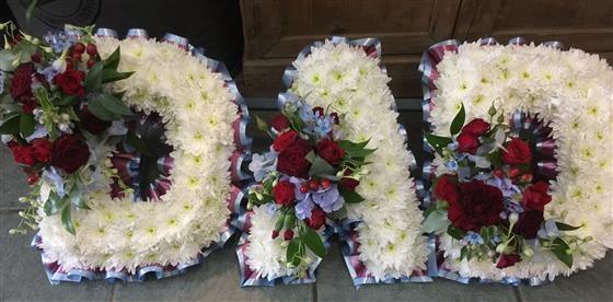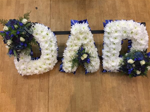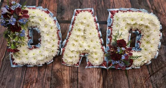 Our massed letter tributes are available with a white chrysanthemum base and sprays in a range of colours.