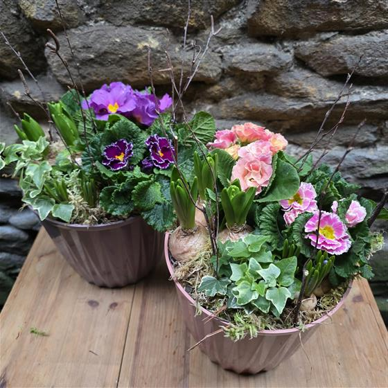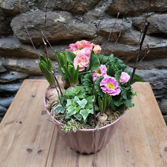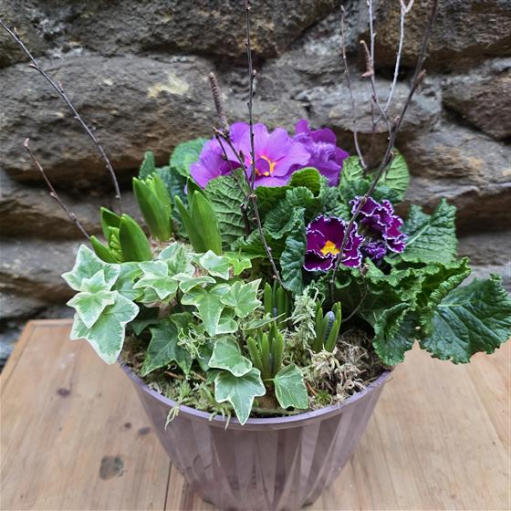 a lovely mixed spring planter including prims, hyacinths and muscari