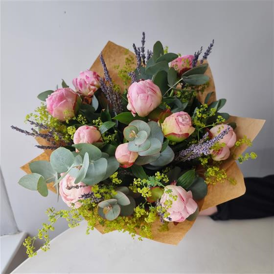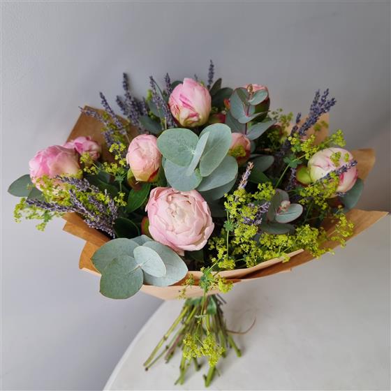 Beautiful summer peonies mixed with lush foliage & dried lavender