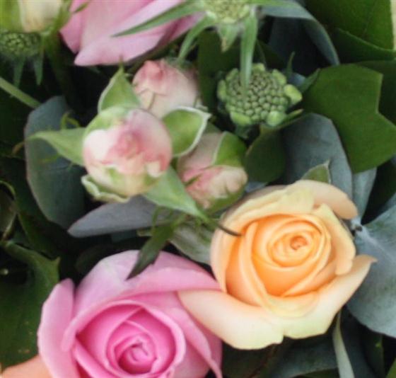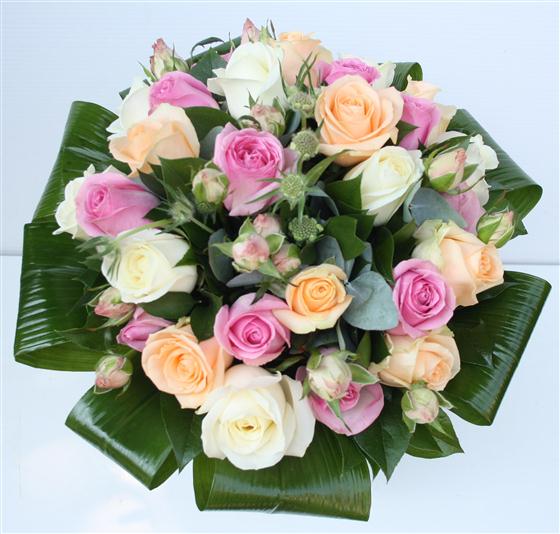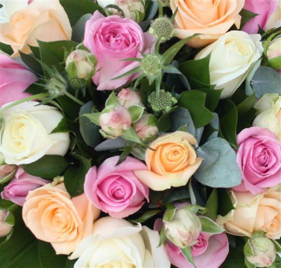 A show stopping hand-tied bouquet of cream, peach and pink roses. Perfect for any occasion.