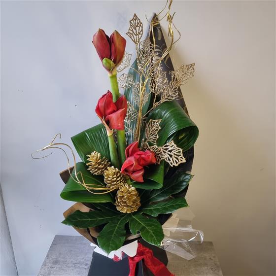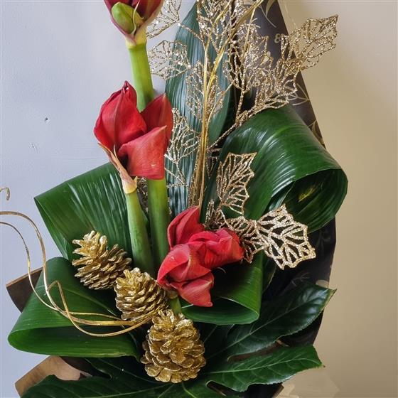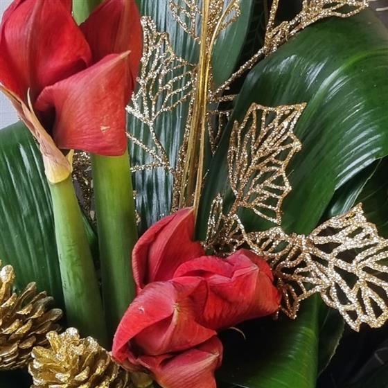 Always a favourite at Christmas the lush red amaryllis, lush foliage & festive gold tin tin, pine cones and an artificial gold leaf stem.