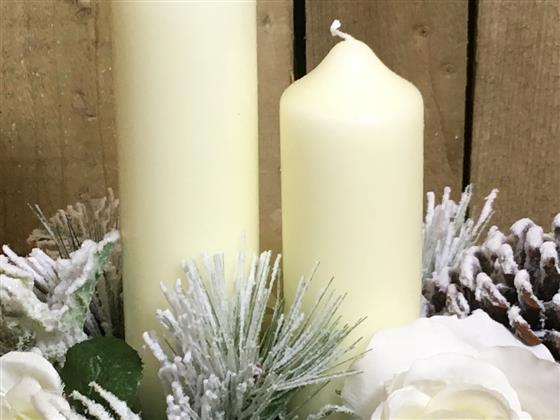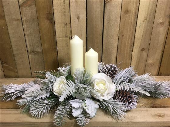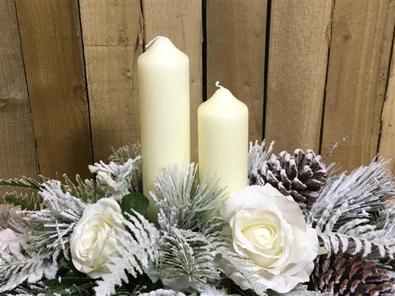 A festive artificial arrangement with large headed white roses, frosted foliage’s and pine cones with long burn time church candles.