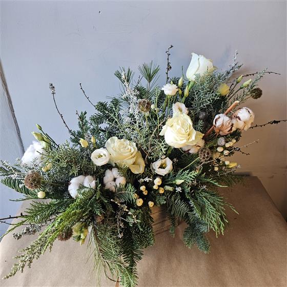 A beautiful, scandi inspired floral arrangement created with wonderful seasonal foliage and flowers.