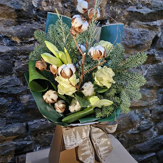 This natural inspired Christmas floral bouquet features Amaryllis, white roses, cotton stems & festive foliage