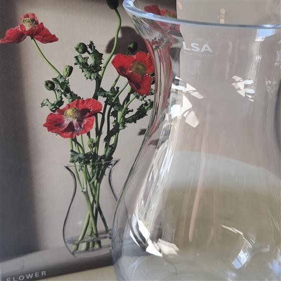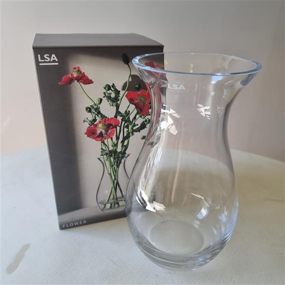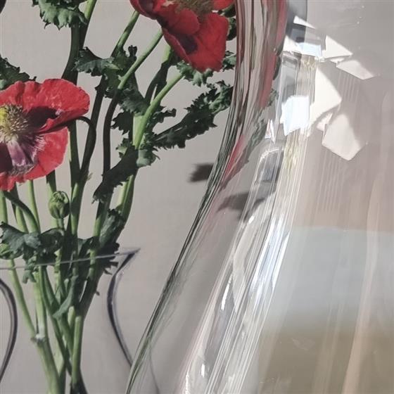A large, mouth blown glass vase with tapered waist, heavy base and thick, curving walls. Designed to hold foliage, branches or tall stemmed flowers.
