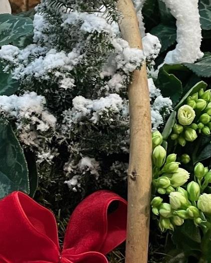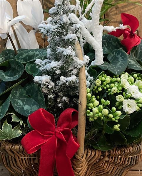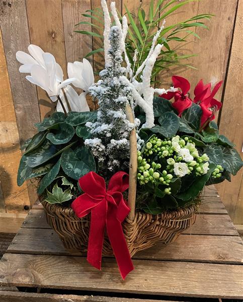A lovely festive mixed planted basket containing Bulbs, cyclamen, kalanchoe, Picea, ivy or other seasonal plants.