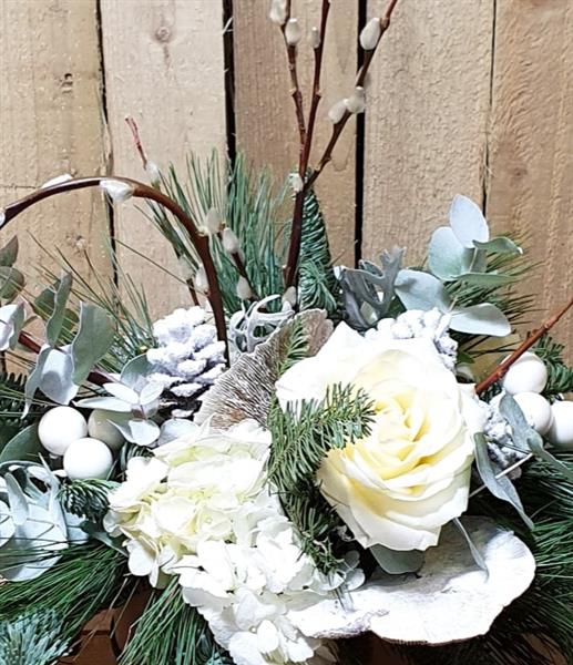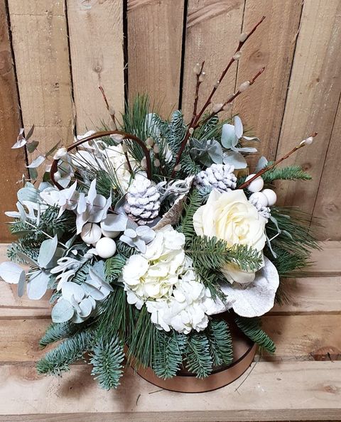 White Festive hat box featuring white hydrangeas, roses, seneccio, flocked pine cones, pussy willow, mushrooms and a selection of festive foliage