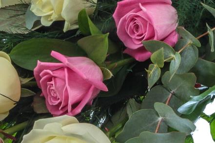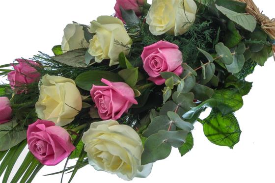 A traditional open sheaf tribute in whites and pinks, including roses & foliage.
