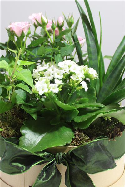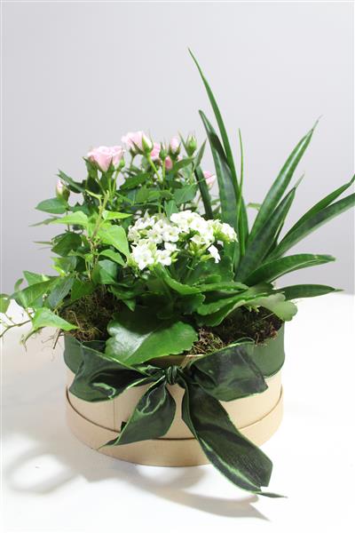 A classic collection of seasonal indoor plants in mixed shades. The selection will normally include two flowering plants such as a spray rose and/or kalanchoe, plus one green plant and ivy to finish off the arrangement. The plants are planted in a stylish 'hatbox' container made from kraft card with a waterproof lining and trimmed with an elegant satin bow.