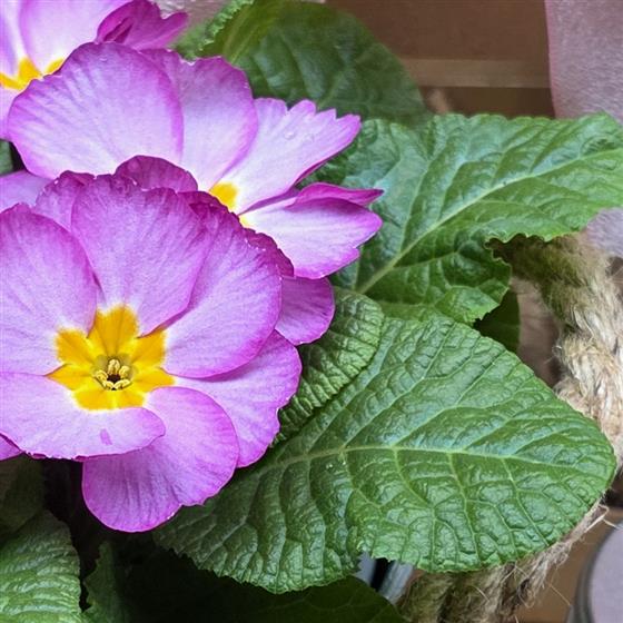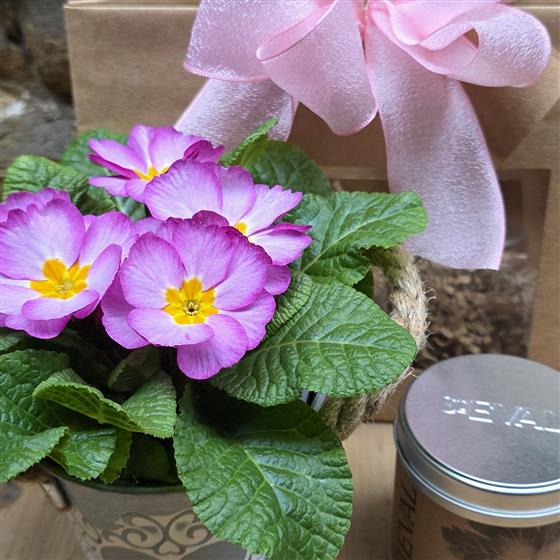 a colourful primrose in a tin with a St Eval scented tin candle, finished in a kraft bag.