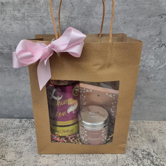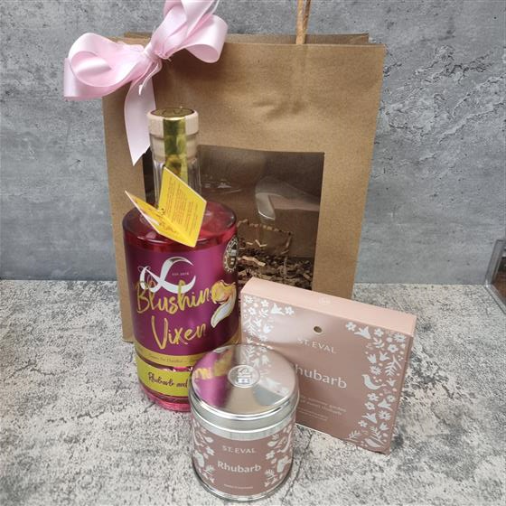 Rhubarb is the fruity and slightly sweet summer scent of fresh rhubarb. This Gift set contains Blushing Vixen Rhubarb & Elderflower 70cl 40%, a St Eval Candle & Tealight box presented in a kraft gift bag.