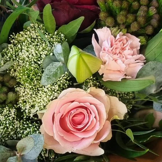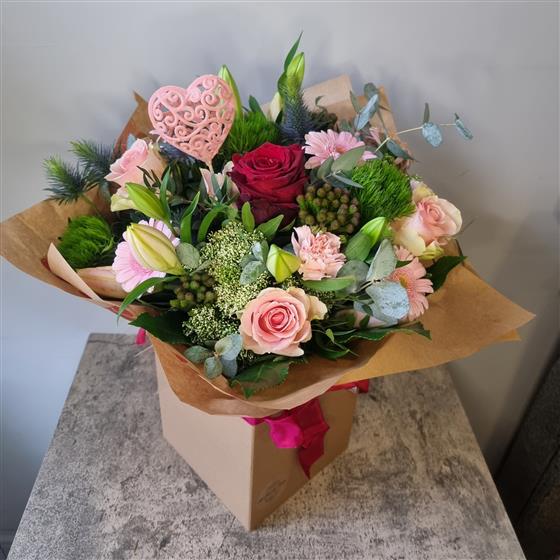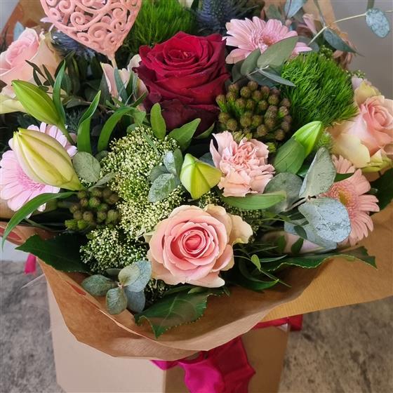 Unsure what to send? Let us create a beautiful bouquet for you! Enhance the romance with a bouquet made with beautiful pink flowers and a red rose in the centre. Our hand-tied bouquets are delivered aqua packed in water.