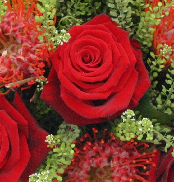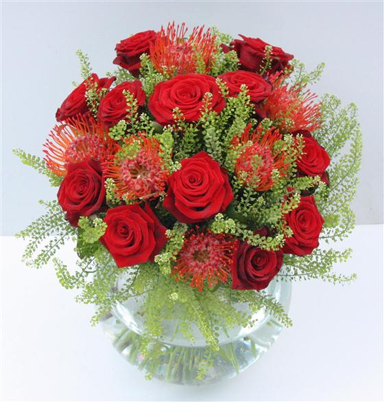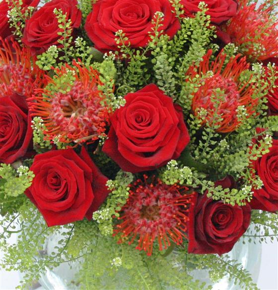 An exotic bouquet of proteas and a dozen velvety red roses interspersed with delicate foliage.