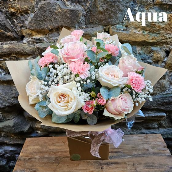 A classic and timeless combination of pinks, blushes and whites. A very feminine combination available as a a handtied ready to put straight into a vase of water (make me eco option) or as an aqua pack delivered in a box with a bubble of water.