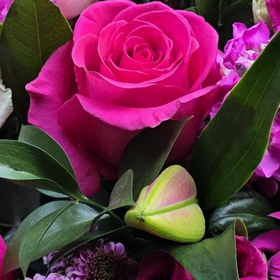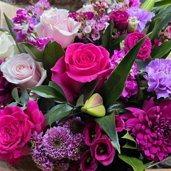 A beautiful feminine bouquet of cerise, pinks, lilacs and purples