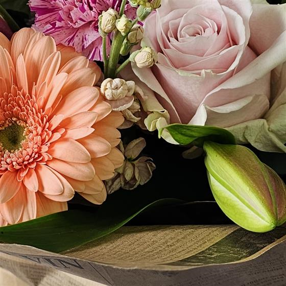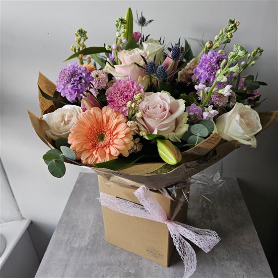 A selection of seasonal blooms in beautiful pastel tones of pinks, peaches and lilacs; including roses, stocks, gerberas & Lilies.
