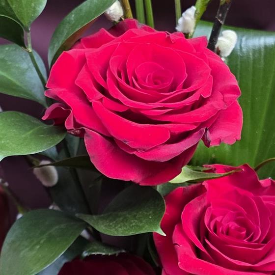 A beautiful handtied trio of red roses with a pussy willow heart
