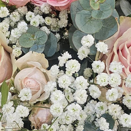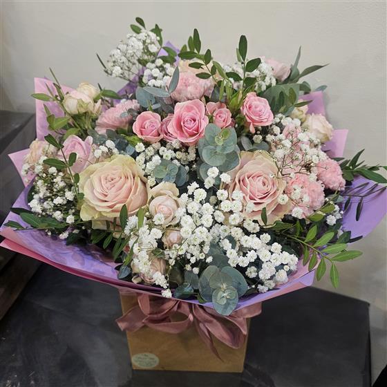 A romantic hand-tied bouquet of pink roses, spray roses, carnations and gypsophila. A classic and timeless combination!