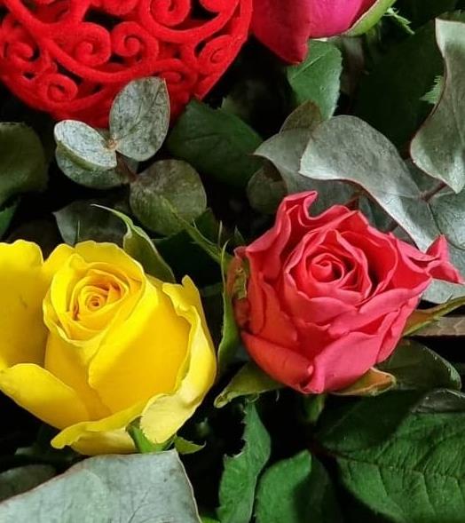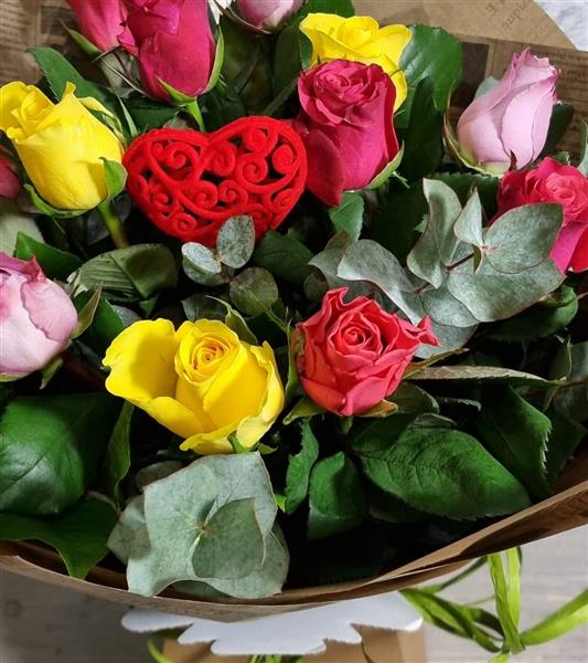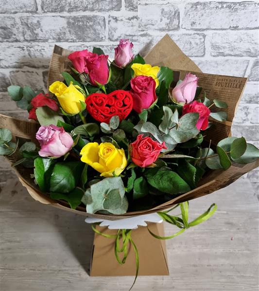 Looking for something colourful ? Take a look at our rainbow dozen ; a colourful selection of exquisite smaller headed roses, lush foliage finished in stylish gift-wrap, a heart pick & aqua box.