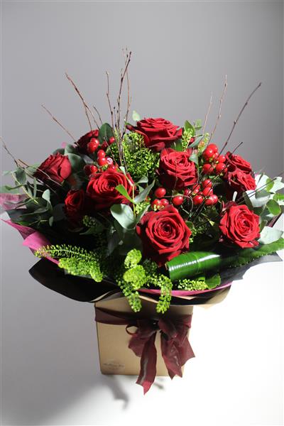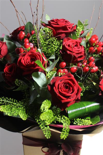 Looking for something a little more special than the standard dozen? Why not upgrade to our luxury roses! A dozen Red Naomi roses with foliage, Berries or gypsophila, stylishly gift-wrapped in water and presented in a box.