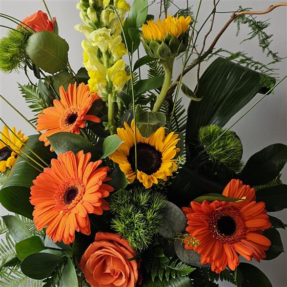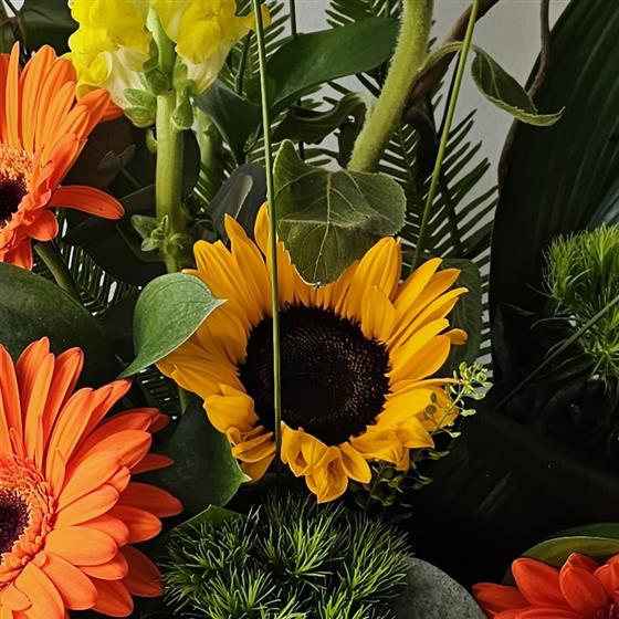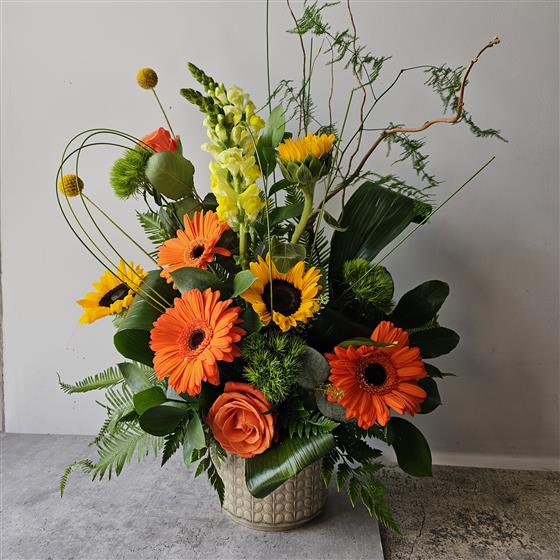 A beautiful arrangement in shades of yellow, orange and greens. Arrives in a stylish pot.