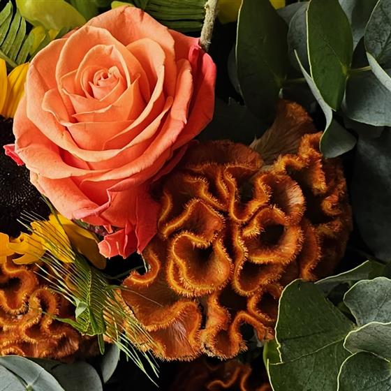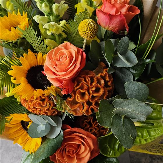 A vibrant bouquet of yellows, oranges and greens.