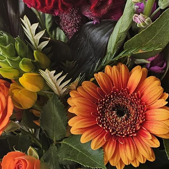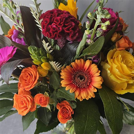 A bright and bold mix of flowers and foliage in a lovely vase.