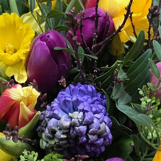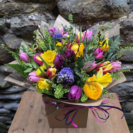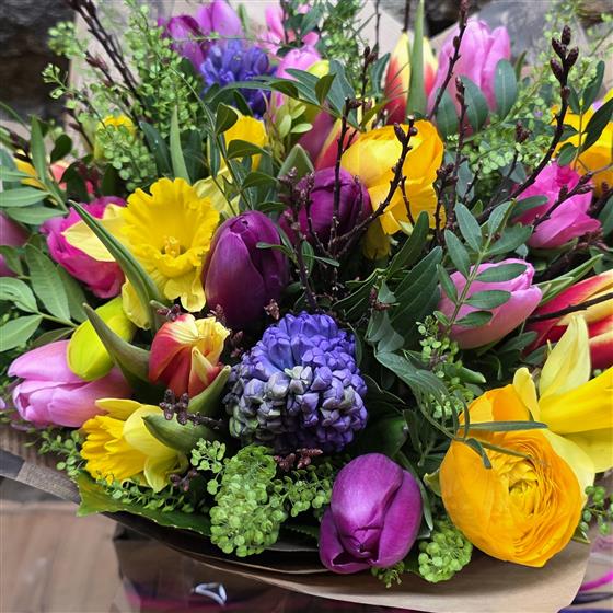 A vibrant selection of spring blooms, hand-tied and presented in an aqua bouquet! Perfect for a thank you, birthday, Mother's Day or get well.