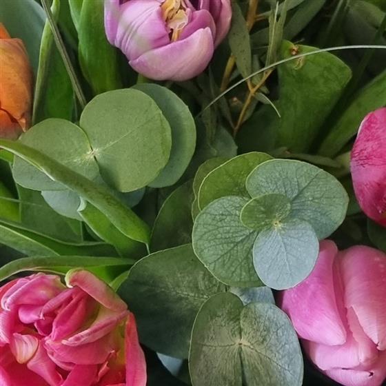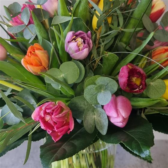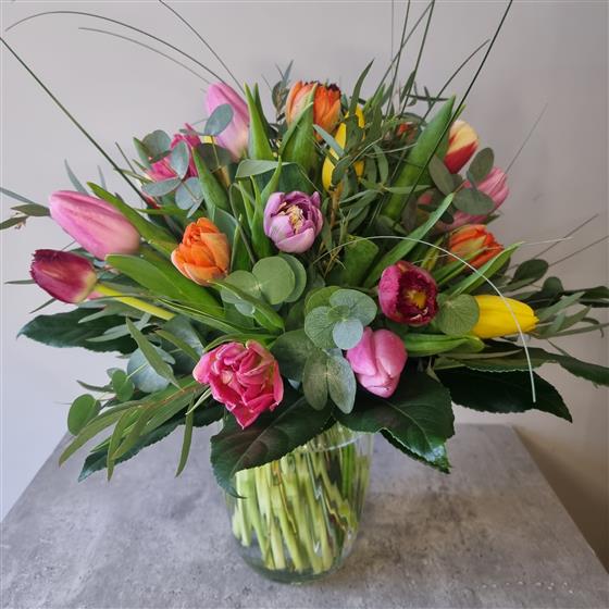 Who doesn't love a simple tulip hand-tied?! Especially when it's displayed in a stunning glass vase! This is the perfect all-in-one floral gift; beautiful flowers plus a vase she can keep and enjoy again. The tulips are a mixture of colours