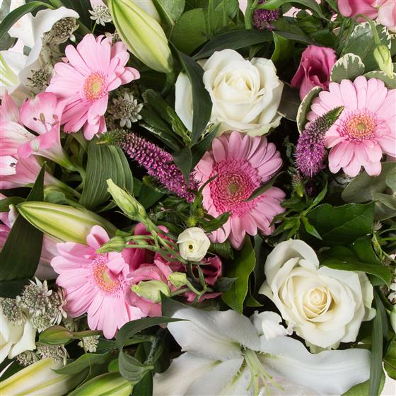 A scented bouquet including oriental lilies, veronica, roses, gerberas and lisianthus presented in a matching gift bag.
