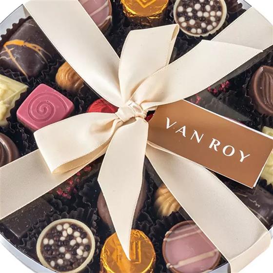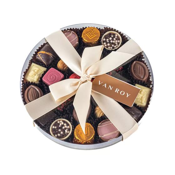An elegant assortment of Belgian chocolates presented in a beautifully wrapped 18cm round gift box, finished with a decorative ribbon. This luxurious collection features a variety of irresistible flavors, such as cherry kirsch, dark chocolate with caramel, white chocolate filled with hazelnut praline, orange-infused praline in dark chocolate, coconut cream in white chocolate, and milk chocolate with mocha cream—plus many more indulgent treats.