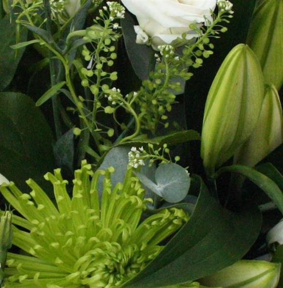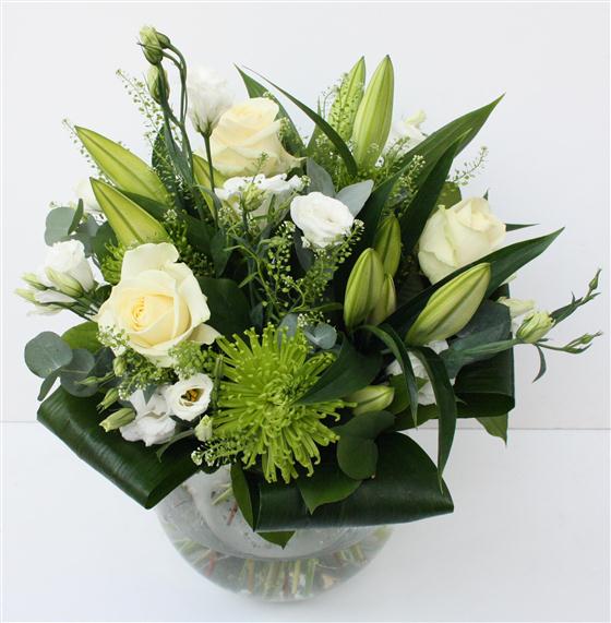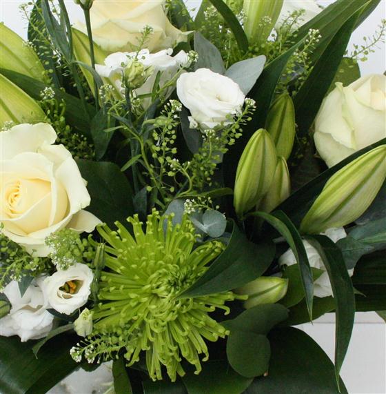 A stunning bouquet filled with white lilies, avalanche roses, white lisianthus and shamrock chrysanths.