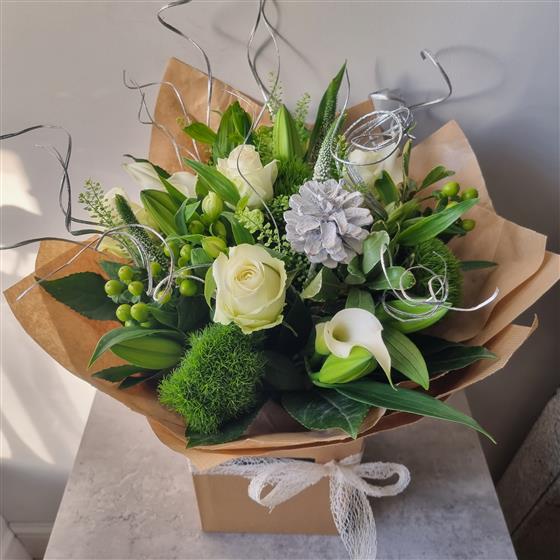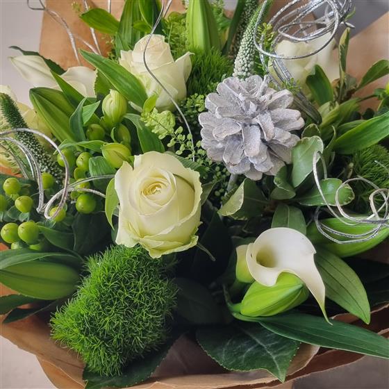 Unsure what to send? Let us create a festive bouquet for you inspired by a white christmas. Our hand-tied bouquets are delivered aqua packed in water.